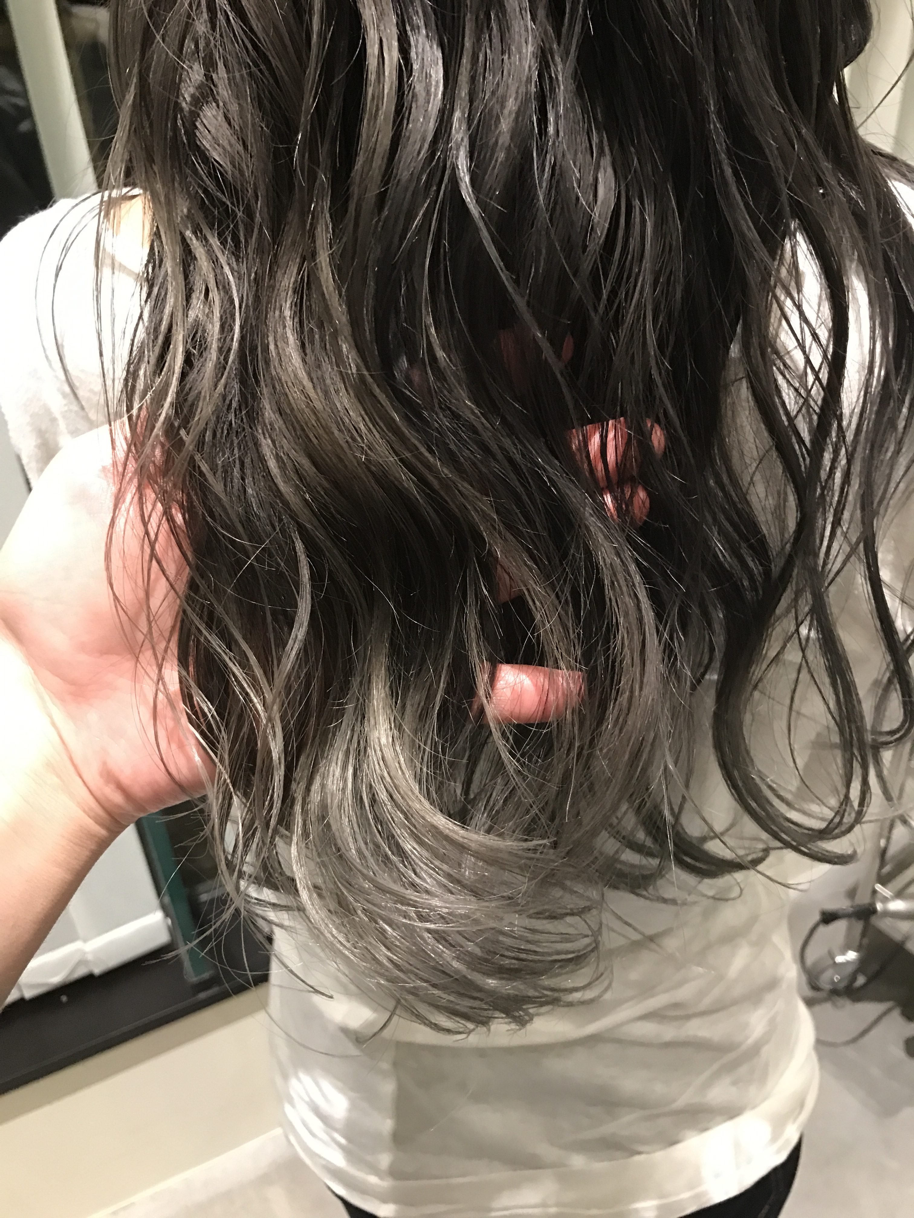 とことん赤みと黄みを押さえ込みました。毛先はホワイトでアソビをプラス。退色した後もとってもカワイイ色になるんですよ(`・ω・´)